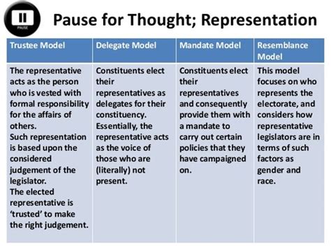 Models Of Representation. A representative may be a delegate, in the sense that they act as a conduit. Key components of political representation 1.1 delegate vs.